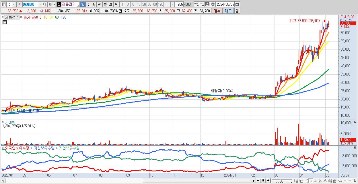 - 제룡전기 (65,700원 ▲ 3.14% , 시총: 10,553억, 외국인 순매수 거래금:104억)