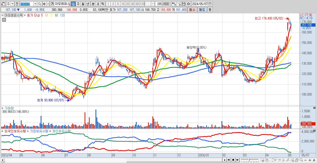 - 아모레퍼시픽 (167,100원 ▼ -0.95% , 시총: 97,741억, 외국인 순매수 거래금:115억)