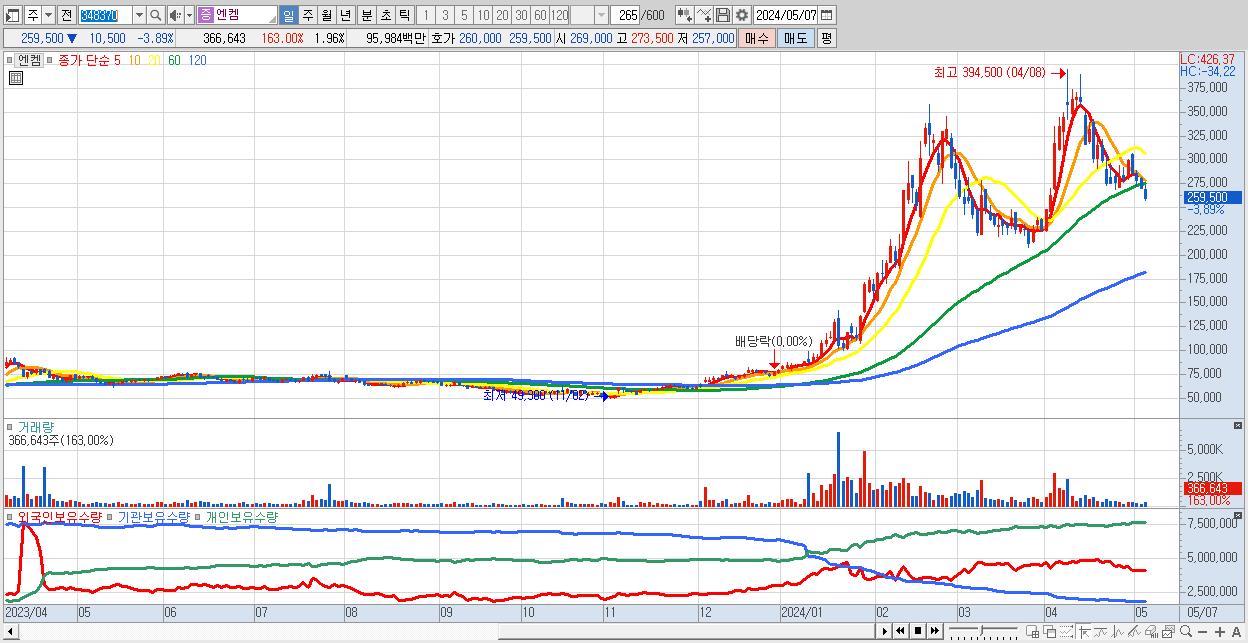 - 엔켐 (259,500원 ▼ -3.89% , 시총: 48,512억, 외국인 순매수 거래금:104억)