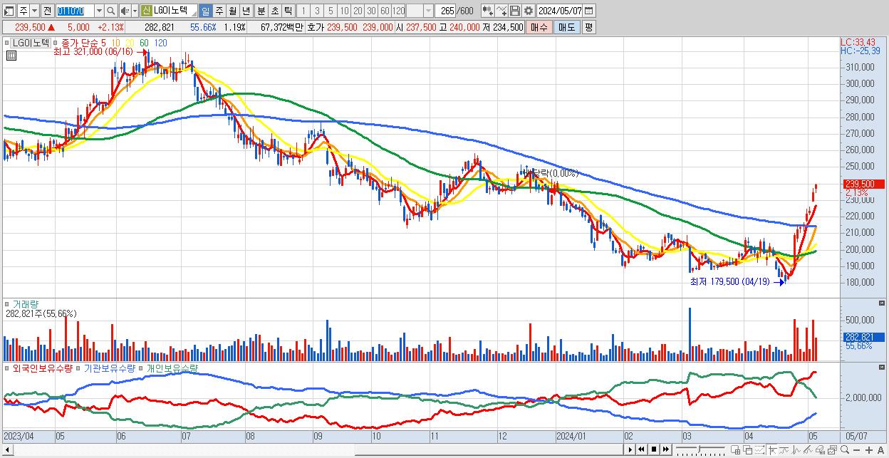 - LG이노텍 (239,500원 ▲ 2.13% , 시총: 56,683억, 외국인 순매수 거래금:152억)