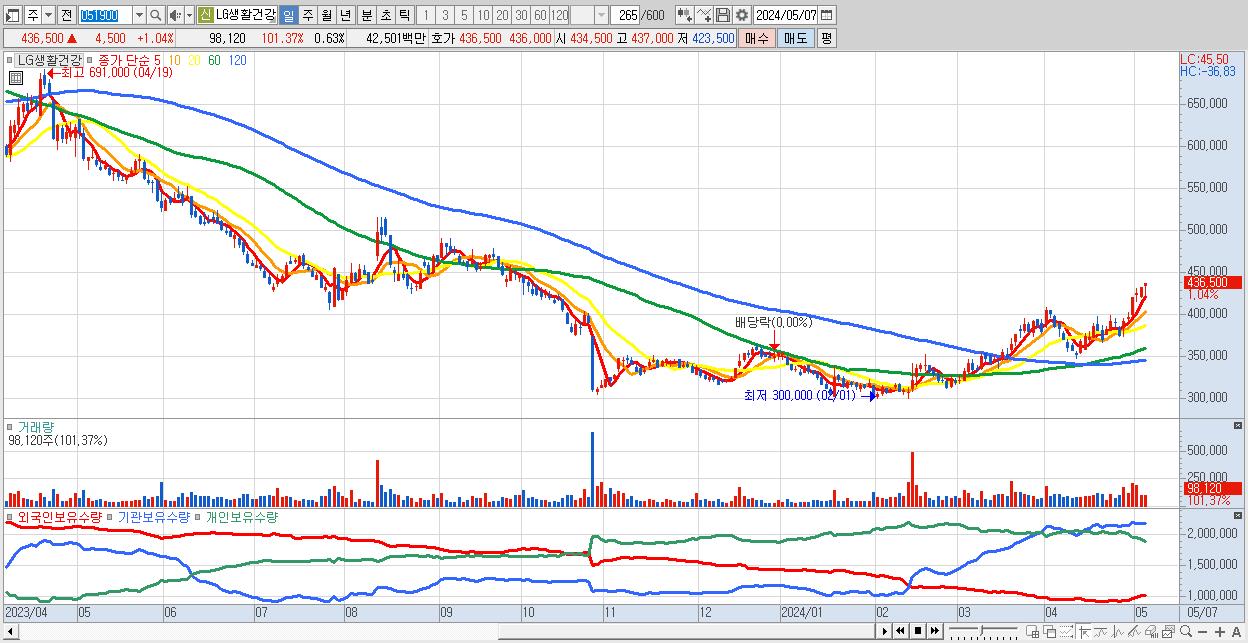 - LG생활건강 (436,500원 ▲ 1.04% , 시총: 68,173억, 외국인 순매수 거래금:124억)