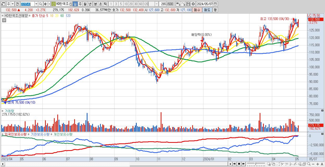- HD한국조선해양 (132,500원 ▲ 3.27% , 시총: 93,774억, 외국인 순매수 거래금:78억)