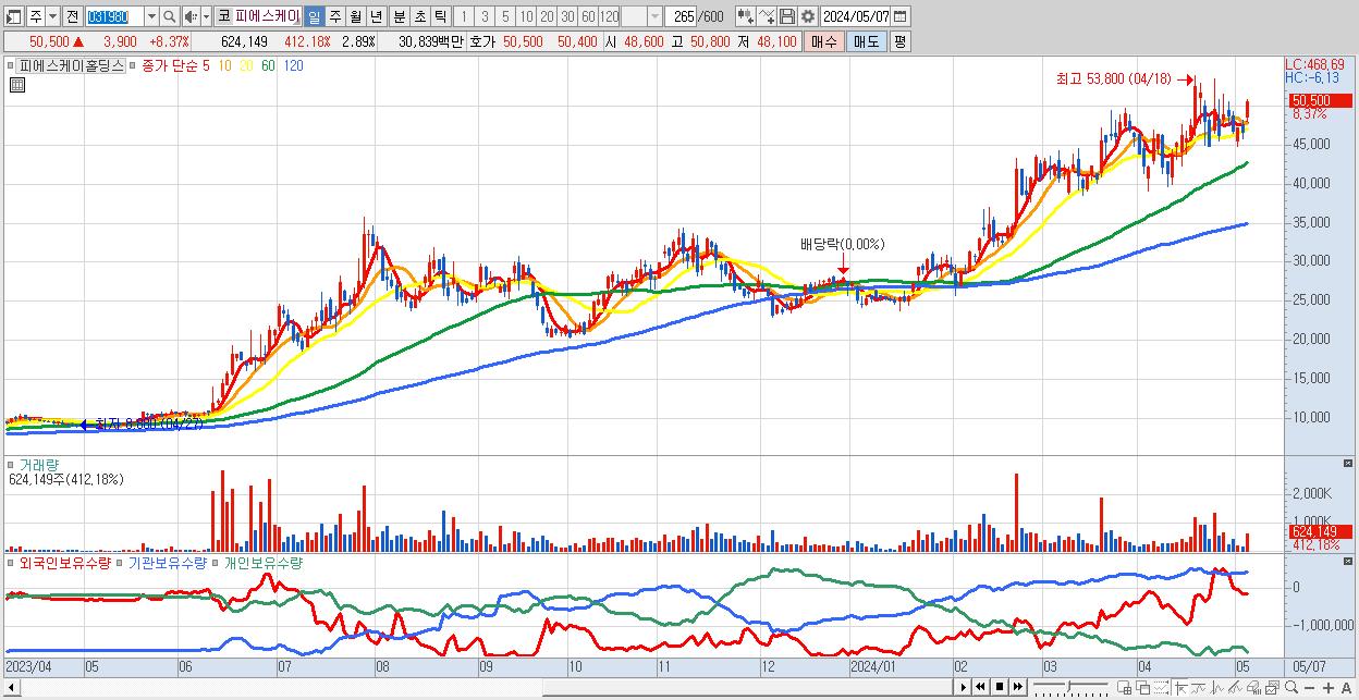 - 피에스케이홀딩스 (50,500원 ▲ 8.37% , 시총: 10,889억, 외국인 순매수 거래금:66억)