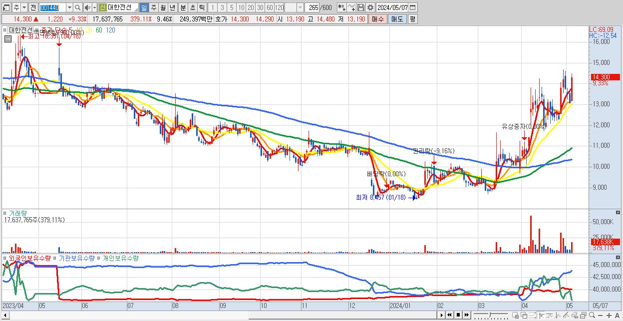 - 대한전선 (14,300원 ▲ 9.33% , 시총: 26,662억, 외국인 순매수 거래금:241억)