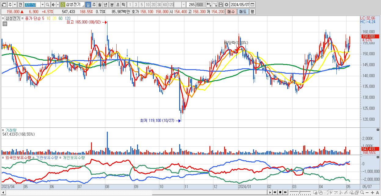 - 삼성전기 (158,000원 ▲ 4.57% , 시총: 118,016억, 외국인 순매수 거래금:183억)
