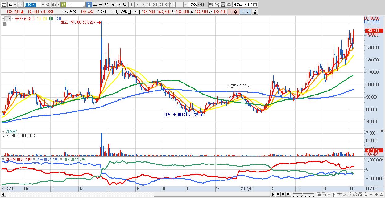 - LS (143,700원 ▲ 10.88% , 시총: 46,271억, 외국인 순매수 거래금:134억)
