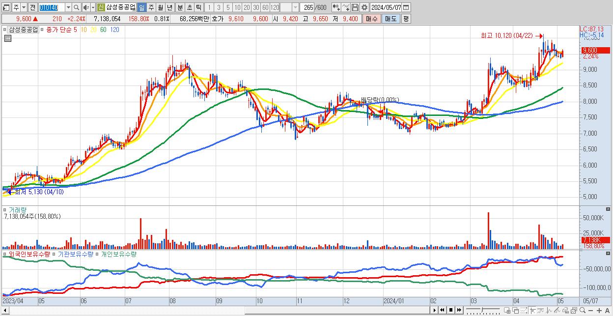 - 삼성중공업 (9,600원 ▲ 2.24% , 시총: 84,480억, 외국인 순매수 거래금:157억)