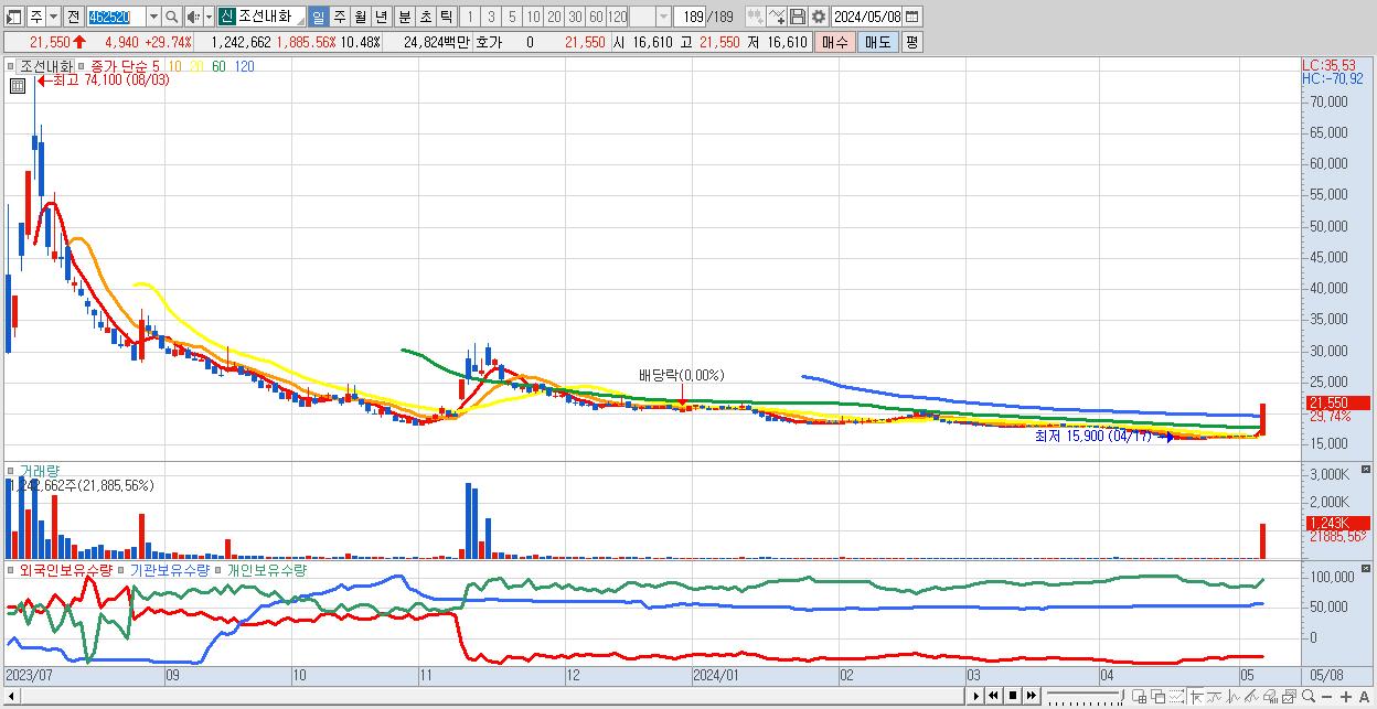 - 조선내화 (21,550원 ▲ 29.74% , 시총: 2,555억, 거래량: 1,242,662, 거래대금:248억)
