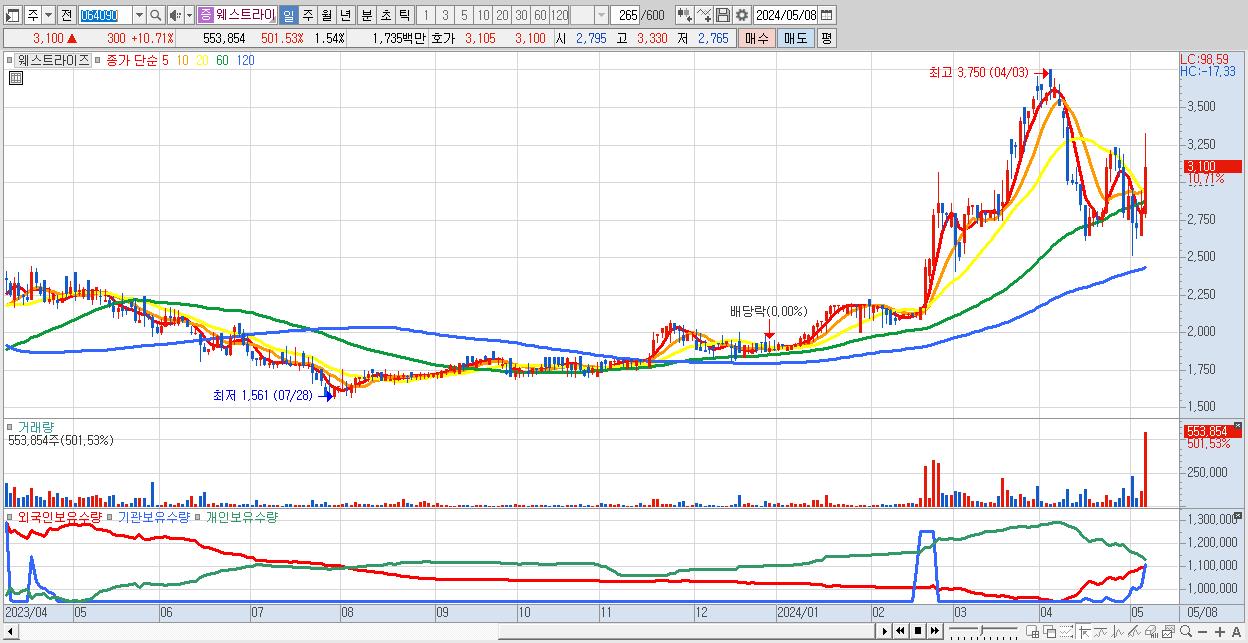 - 웨스트라이즈 (3,100원 ▲ 10.71% , 시총: 1,114억, 거래량: 553,854, 거래대금:17억)