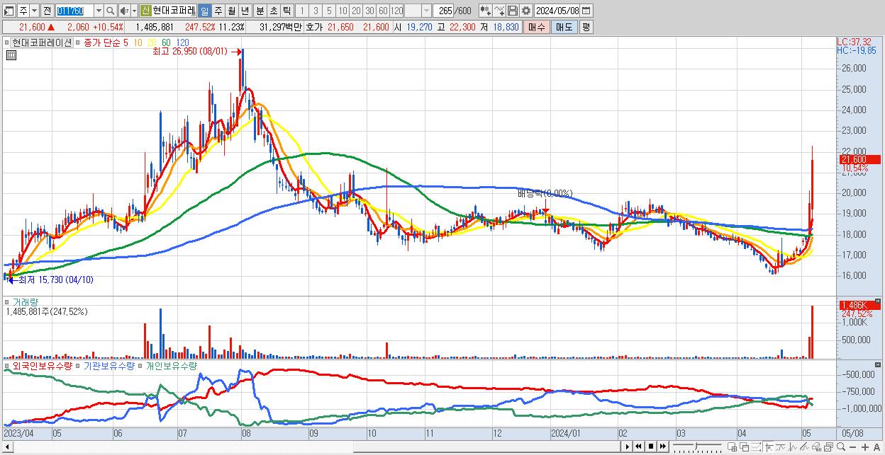 - 현대코퍼레이션 (21,600원 ▲ 10.54% , 시총: 2,857억, 거래량: 1,485,881, 거래대금:313억)