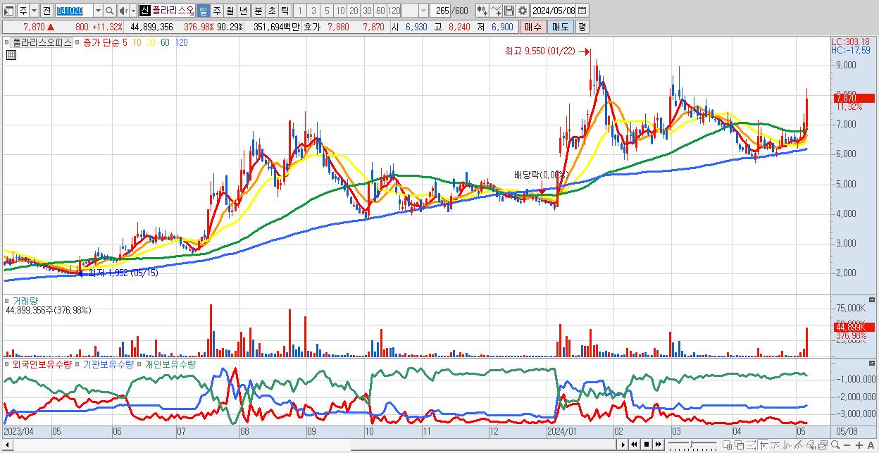 - 폴라리스오피스 (7,870원 ▲ 11.32% , 시총: 3,913억, 거래량: 44,899,356, 거래대금:3,517억)