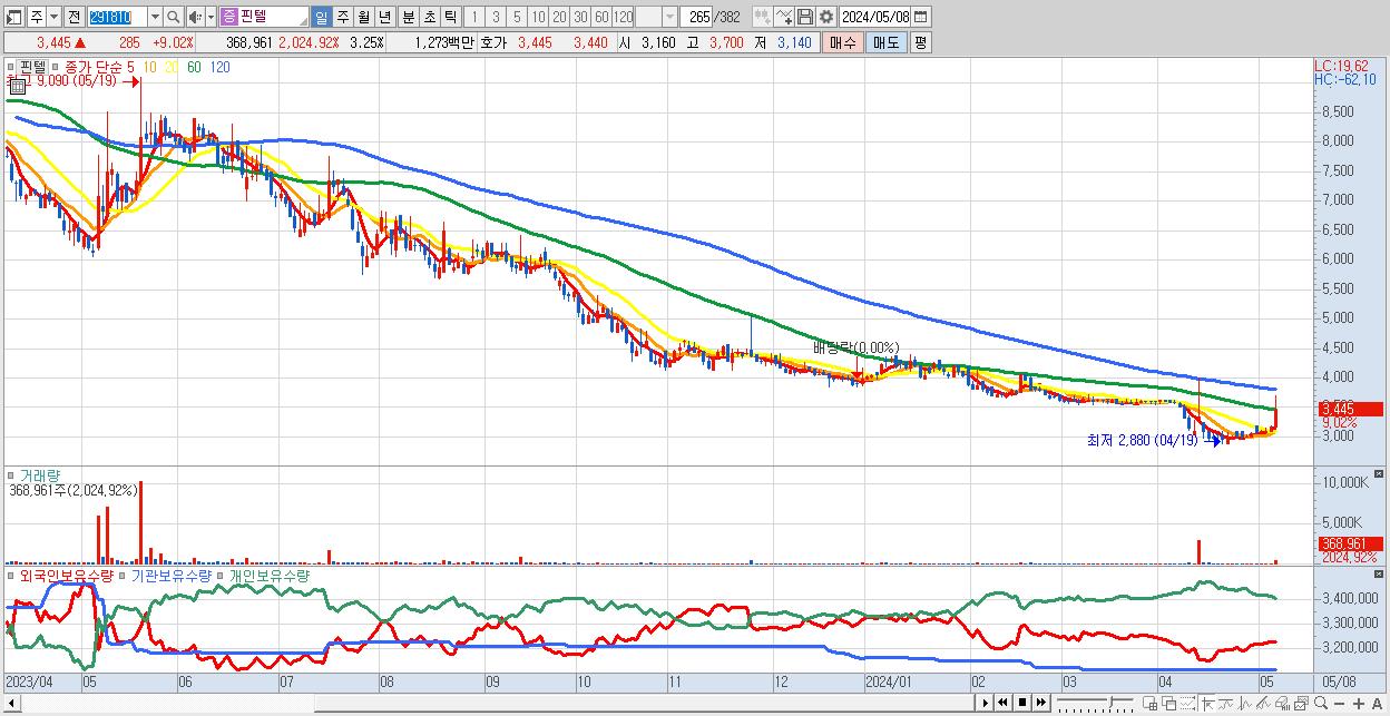 - 핀텔 (3,445원 ▲ 9.02% , 시총: 391억, 거래량: 368,961, 거래대금:13억)