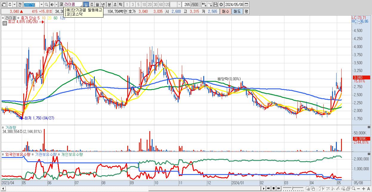 - 라이콤 (3,040원 ▲ 15.81% , 시총: 909억, 거래량: 34,388,554, 거래대금:1,047억)