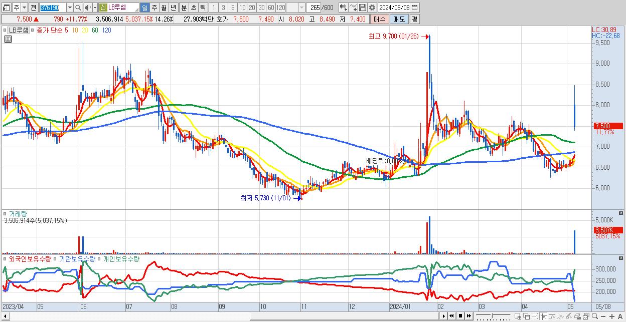 - LB루셈 (7,500원 ▲ 11.77% , 시총: 1,845억, 거래량: 3,506,914, 거래대금:279억)