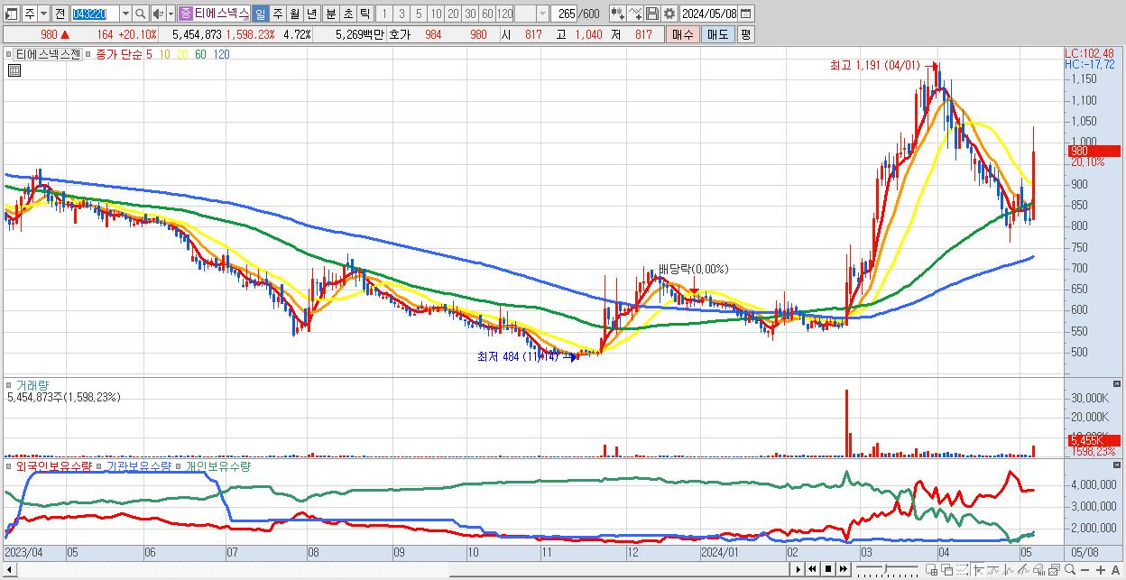 - 티에스넥스젠 (980원 ▲ 20.1% , 시총: 1,132억, 거래량: 5,454,873, 거래대금:53억)