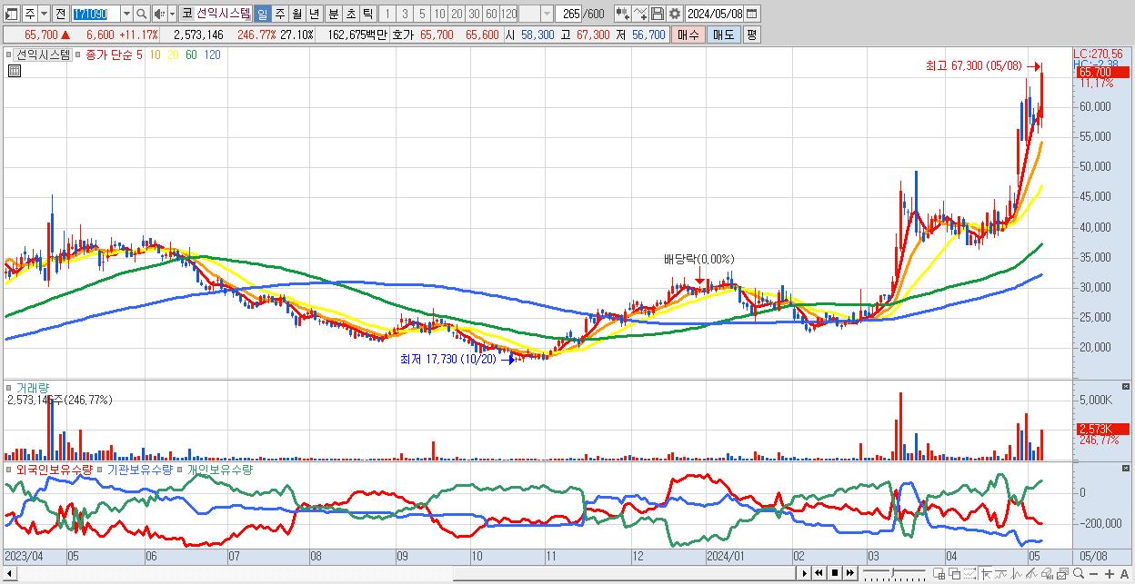 - 선익시스템 (65,700원 ▲ 11.17% , 시총: 6,238억, 거래량: 2,573,146, 거래대금:1,627억)