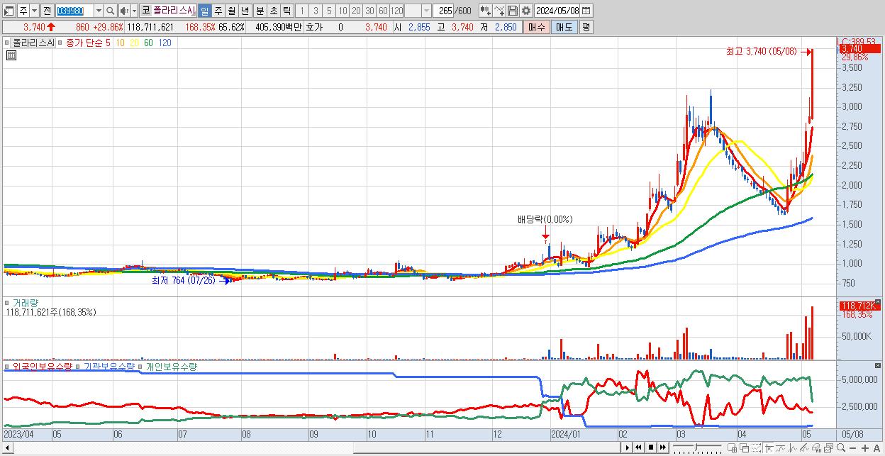 - 폴라리스AI (3,740원 ▲ 29.86% , 시총: 2,681억, 거래량: 118,711,621, 거래대금:4,054억)