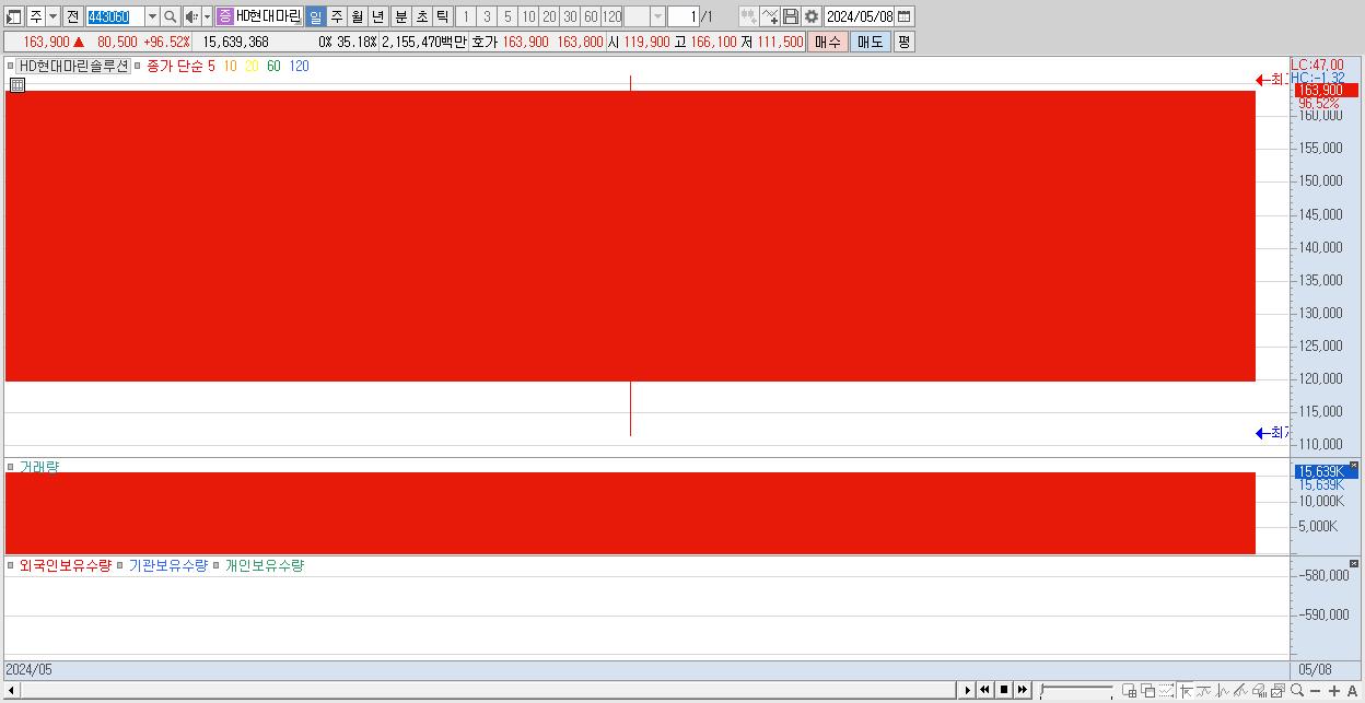 - HD현대마린솔루션 (163,900원 ▲ 96.52% , 시총: 72,854억, 거래량: 15,639,368, 거래대금:21,555억)