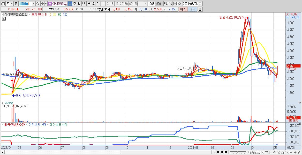 - 상상인인더스트리 (2,460원 ▲ 13.1% , 시총: 696억, 거래량: 743,951, 거래대금:18억)