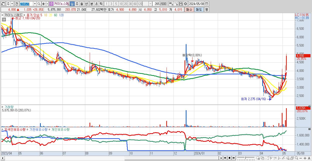 - 카이노스메드 (4,890원 ▲ 26.85% , 시총: 1,365억, 거래량: 5,875,991, 거래대금:276억)