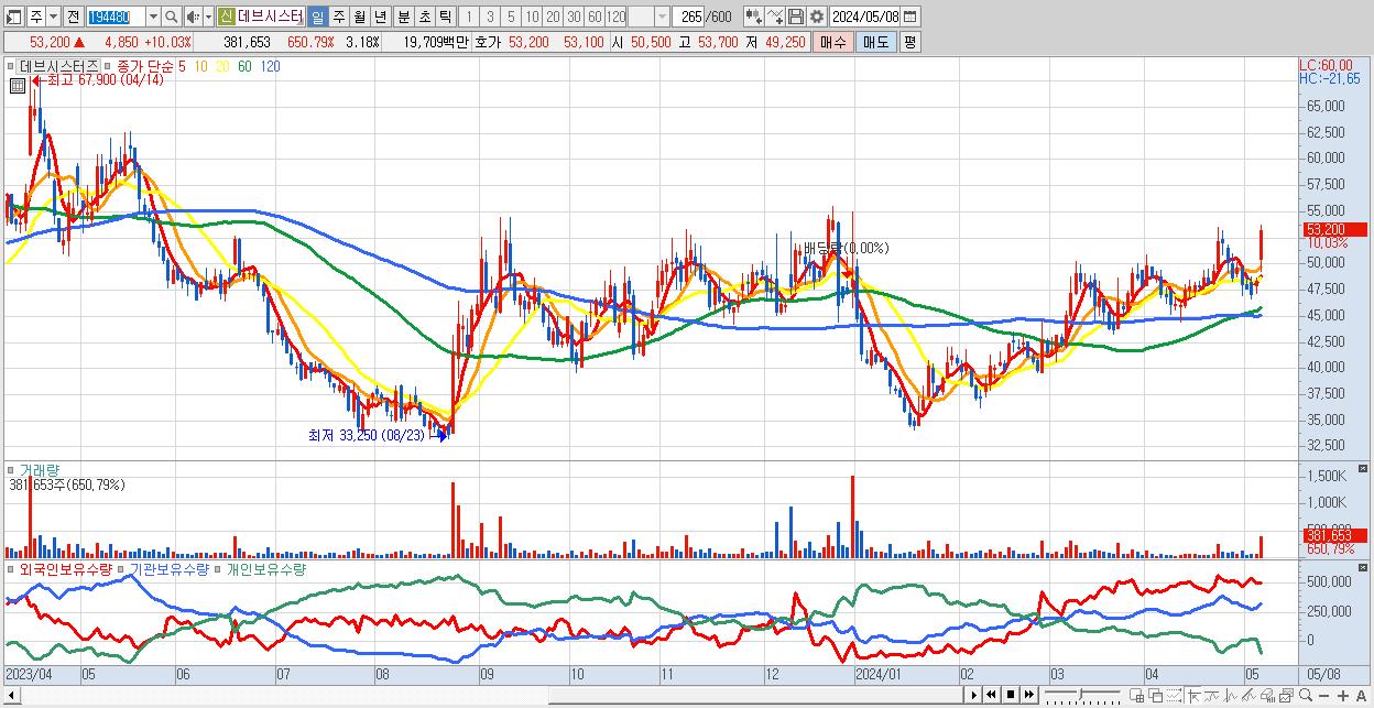 - 데브시스터즈 (53,200원 ▲ 10.03% , 시총: 6,383억, 거래량: 381,653, 거래대금:197억)