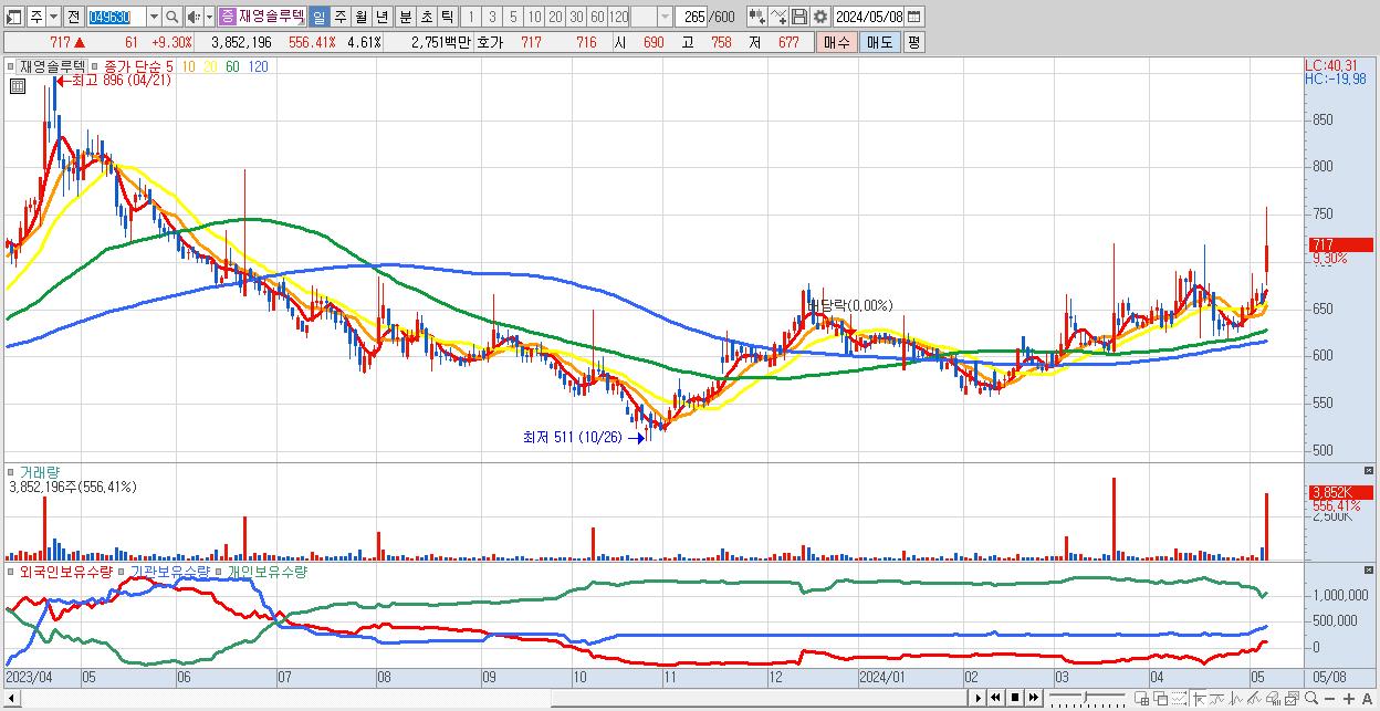 - 재영솔루텍 (717원 ▲ 9.3% , 시총: 600억, 거래량: 3,852,196, 거래대금:28억)