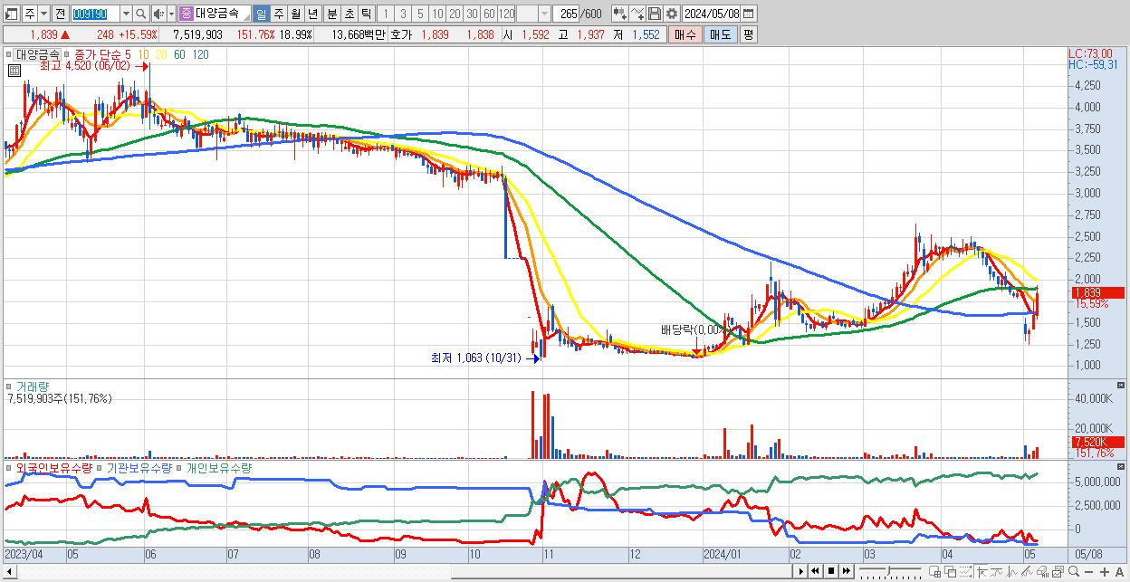 - 대양금속 (1,839원 ▲ 15.59% , 시총: 728억, 거래량: 7,519,903, 거래대금:137억)