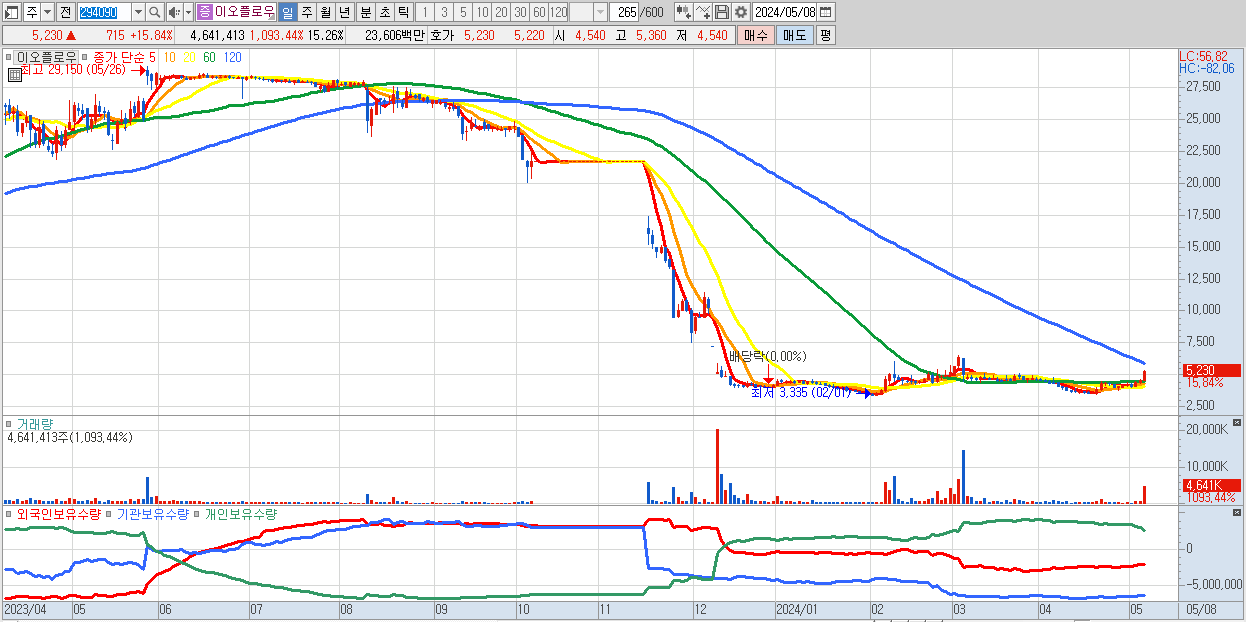 - 이오플로우 (5,230원 ▲ 15.84% , 시총: 1,591억, 거래량: 4,641,413, 거래대금:236억)