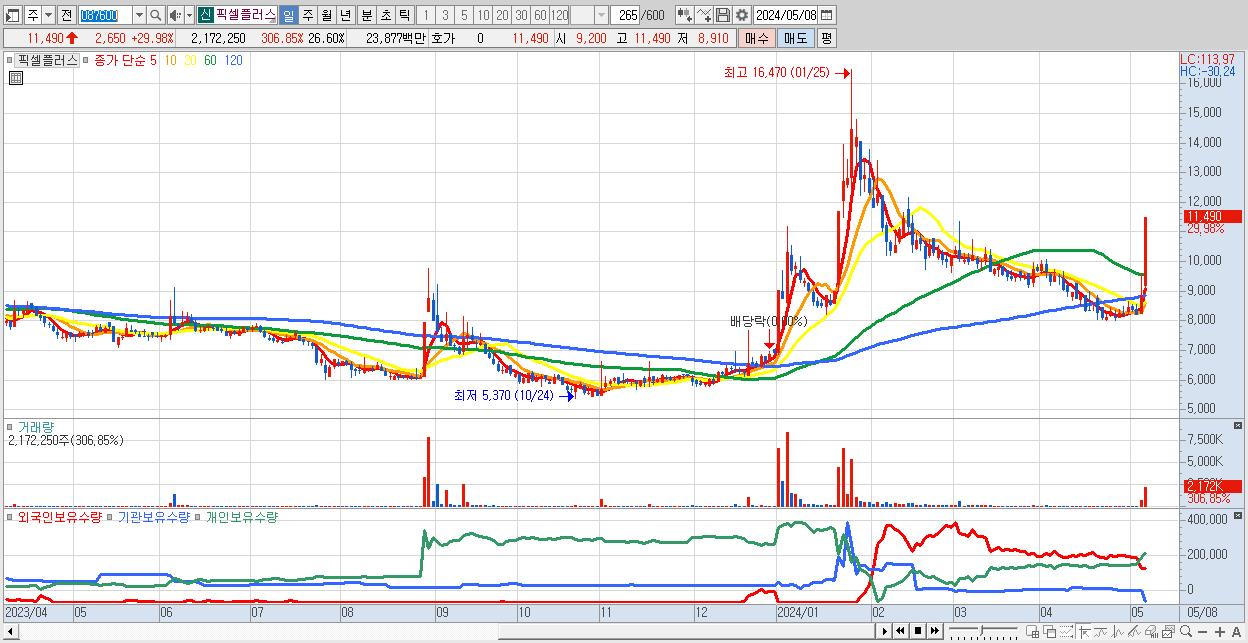 - 픽셀플러스 (11,490원 ▲ 29.98% , 시총: 938억, 거래량: 2,172,250, 거래대금:239억)