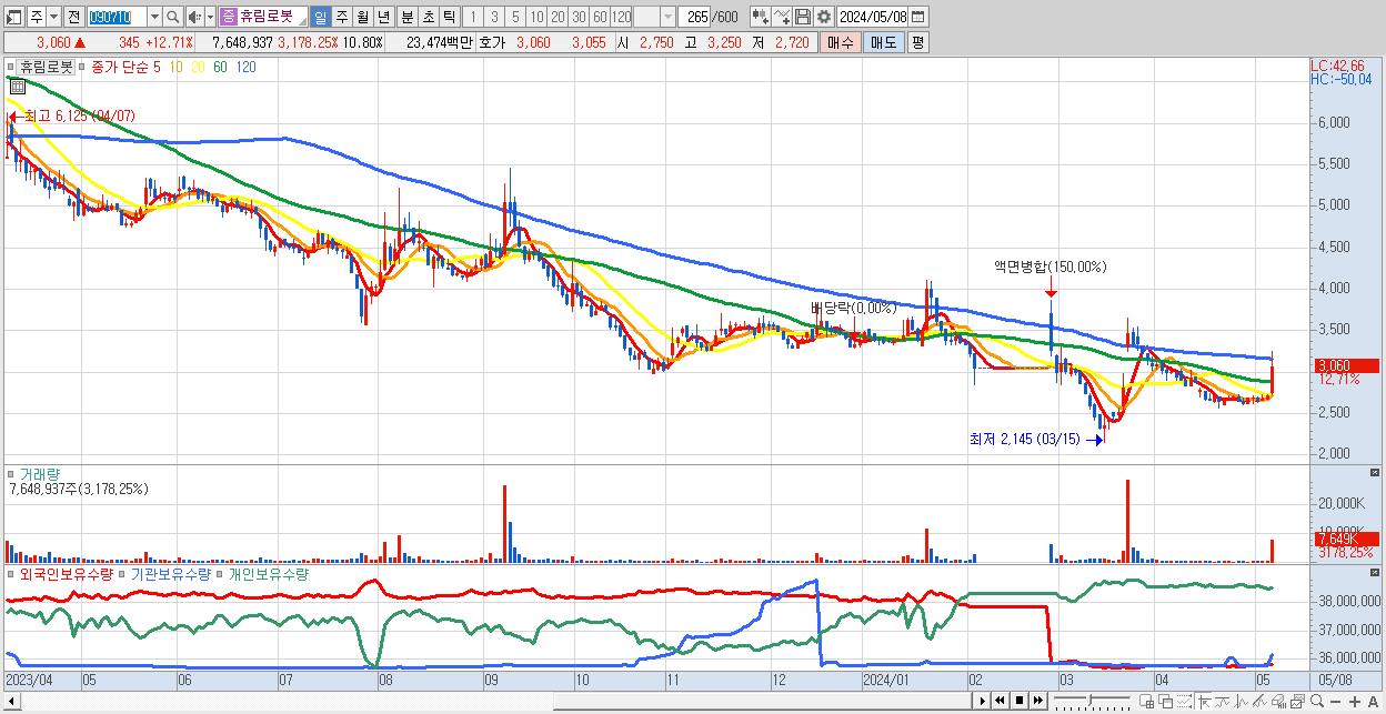 - 휴림로봇 (3,060원 ▲ 12.71% , 시총: 2,166억, 거래량: 7,648,937, 거래대금:235억)