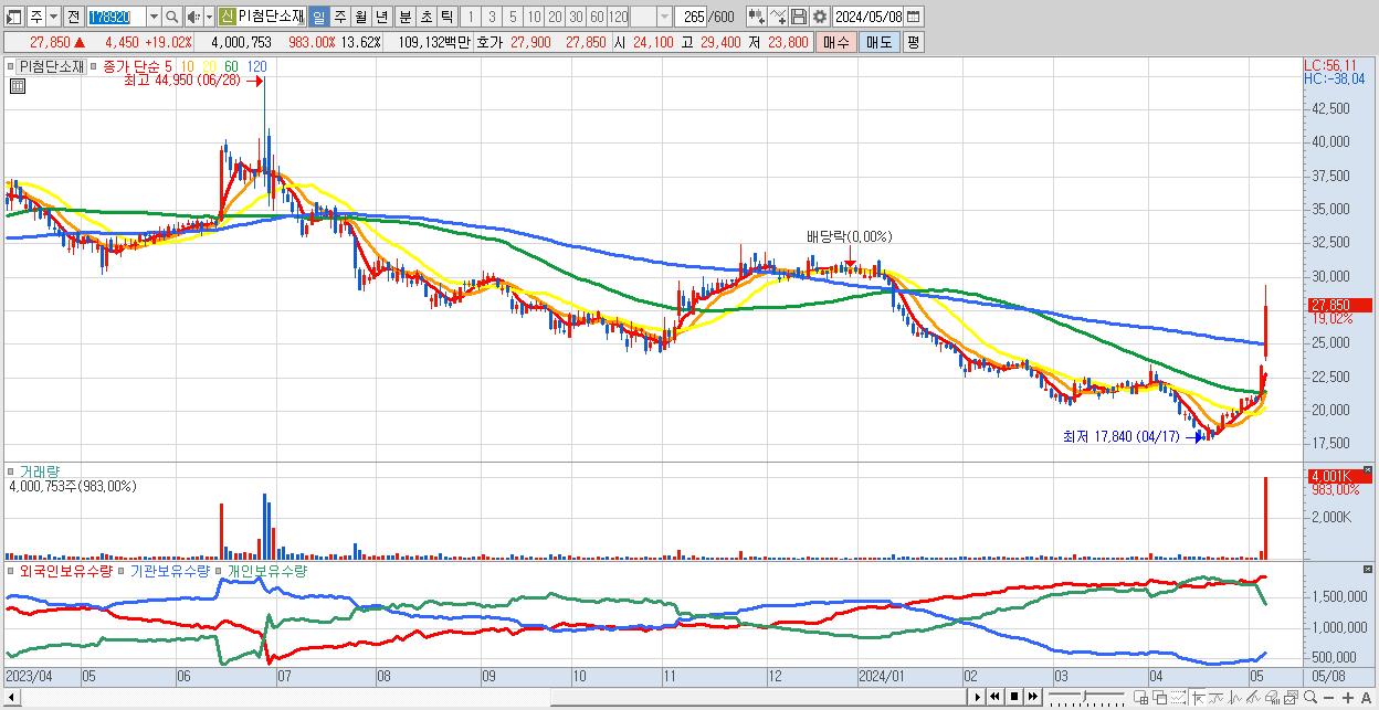 - PI첨단소재 (27,850원 ▲ 19.02% , 시총: 8,179억, 거래량: 4,000,753, 거래대금:1,091억)