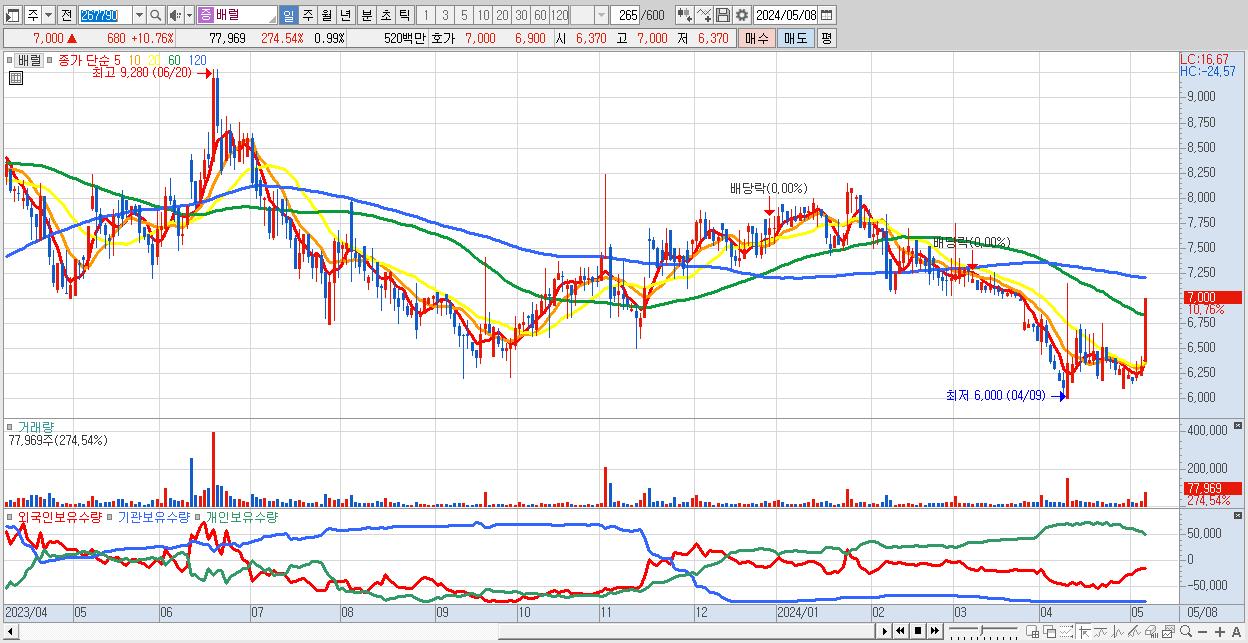 - 배럴 (7,000원 ▲ 10.76% , 시총: 552억, 거래량: 77,969, 거래대금:5억)