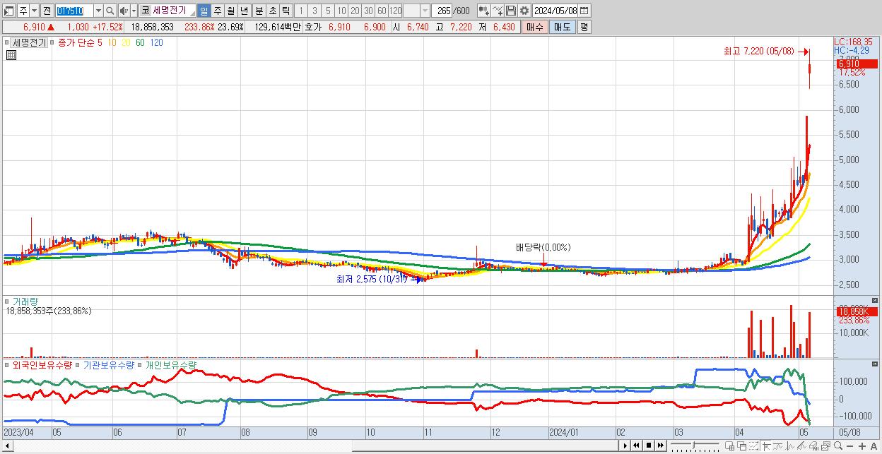 - 세명전기 (6,910원 ▲ 17.52% , 시총: 1,053억, 거래량: 18,858,353, 거래대금:1,296억)