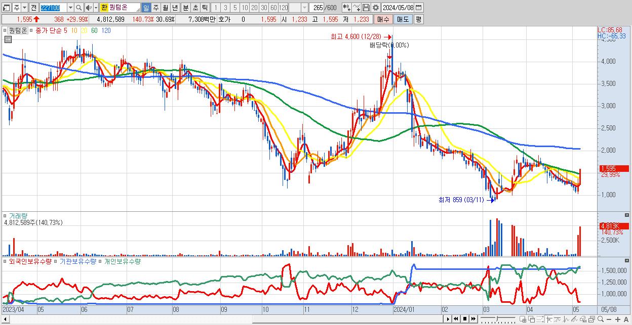 - 퀀텀온 (1,595원 ▲ 29.99% , 시총: 250억, 거래량: 4,812,589, 거래대금:73억)
