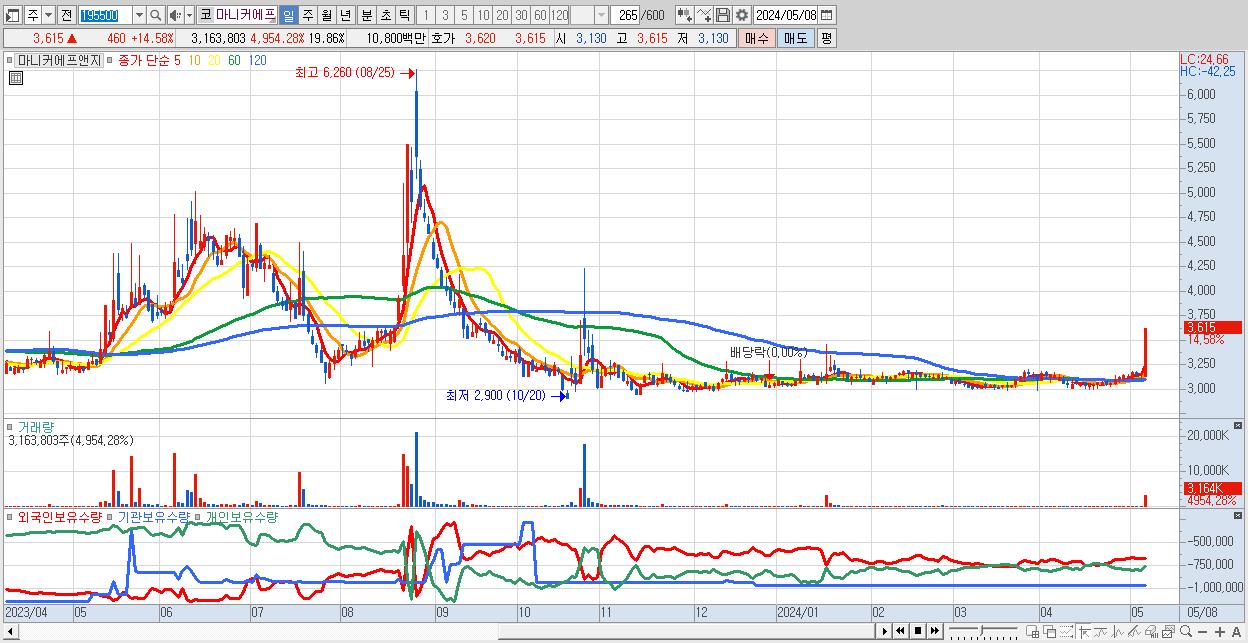 - 마니커에프앤지 (3,615원 ▲ 14.58% , 시총: 576억, 거래량: 3,163,803, 거래대금:108억)