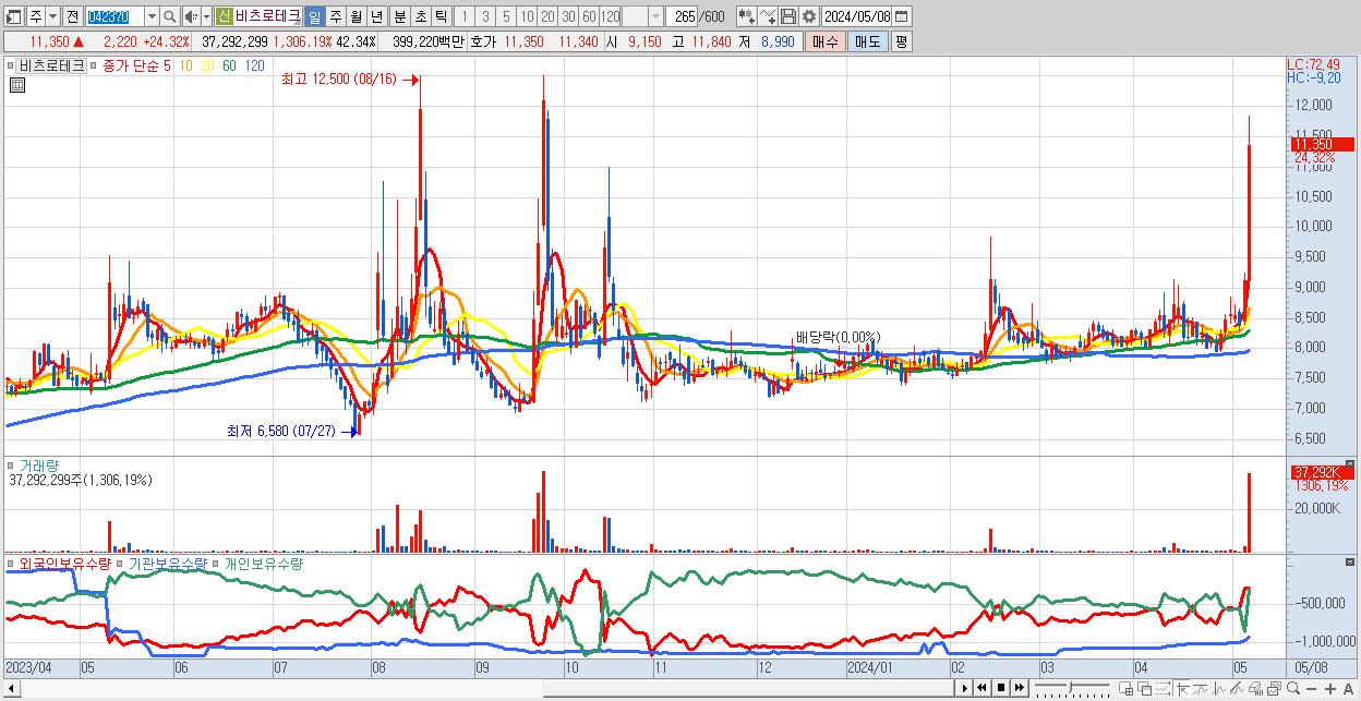 - 비츠로테크 (11,350원 ▲ 24.32% , 시총: 2,974억, 거래량: 37,292,299, 거래대금:3,992억)