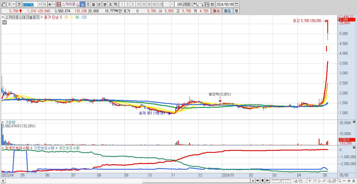 - 스카이문스테크놀로지 (5,700원 ▲ 29.84% , 시총: 976억, 거래량: 3,560,674, 거래대금:188억)
