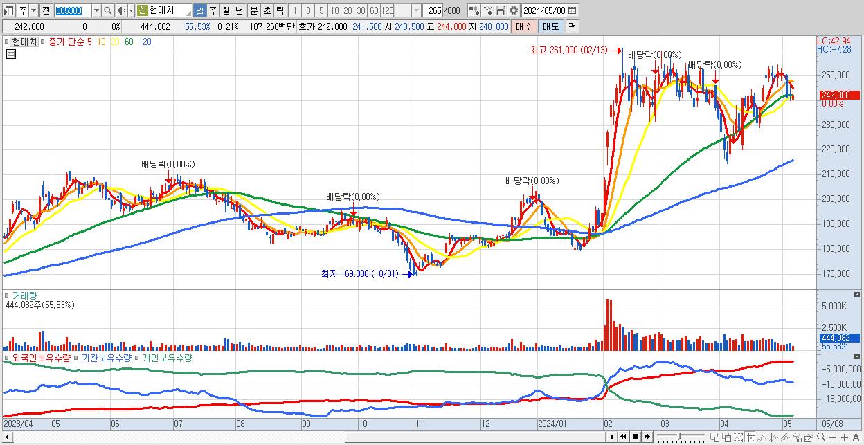 - 현대차 (242,000원 0% , 시총: 506,787억, 거래량: 444,082, 거래대금:1,073억)
