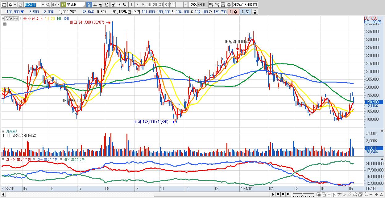 - NAVER (190,900원 ▼ -2% , 시총: 310,038억, 거래량: 1,000,782, 거래대금:1,911억)