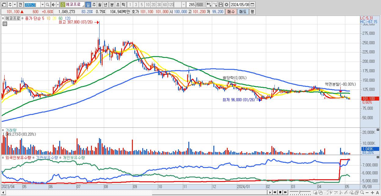 - 에코프로 (101,100원 ▲ 0.6% , 시총: 134,603억, 거래량: 1,049,273, 거래대금:1,049억)