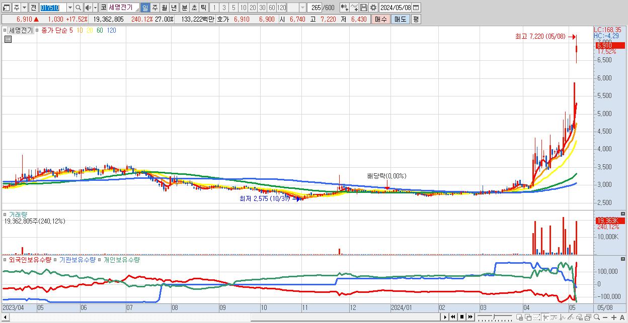 - 세명전기 (6,910원 ▲ 17.52% , 시총: 1,053억, 거래량: 19,362,805, 거래대금:1,332억)
