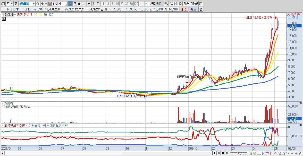 - 와이씨 (14,600원 ▼ -7.83% , 시총: 11,979억, 거래량: 10,488,230, 거래대금:1,549억)