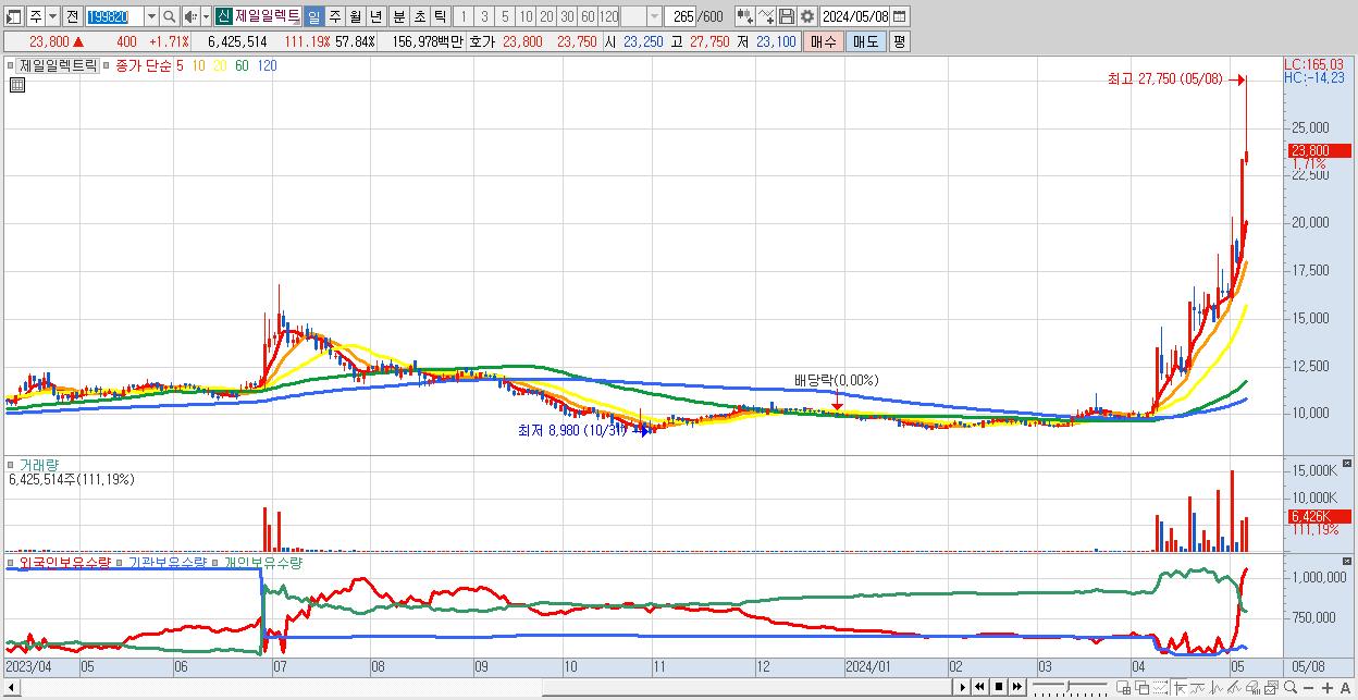 - 제일일렉트릭 (23,800원 ▲ 1.71% , 시총: 2,644억, 거래량: 6,425,514, 거래대금:1,570억)