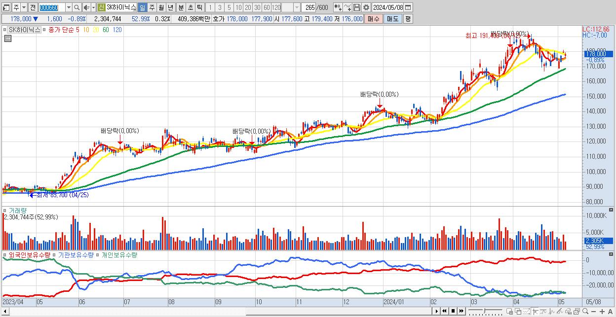 - SK하이닉스 (178,000원 ▼ -0.89% , 시총: 1,295,844억, 거래량: 2,304,744, 거래대금:4,094억)