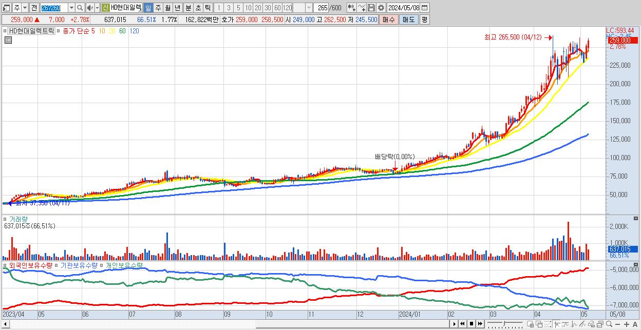 - HD현대일렉트릭 (259,000원 ▲ 2.78% , 시총: 93,362억, 거래량: 637,015, 거래대금:1,628억)