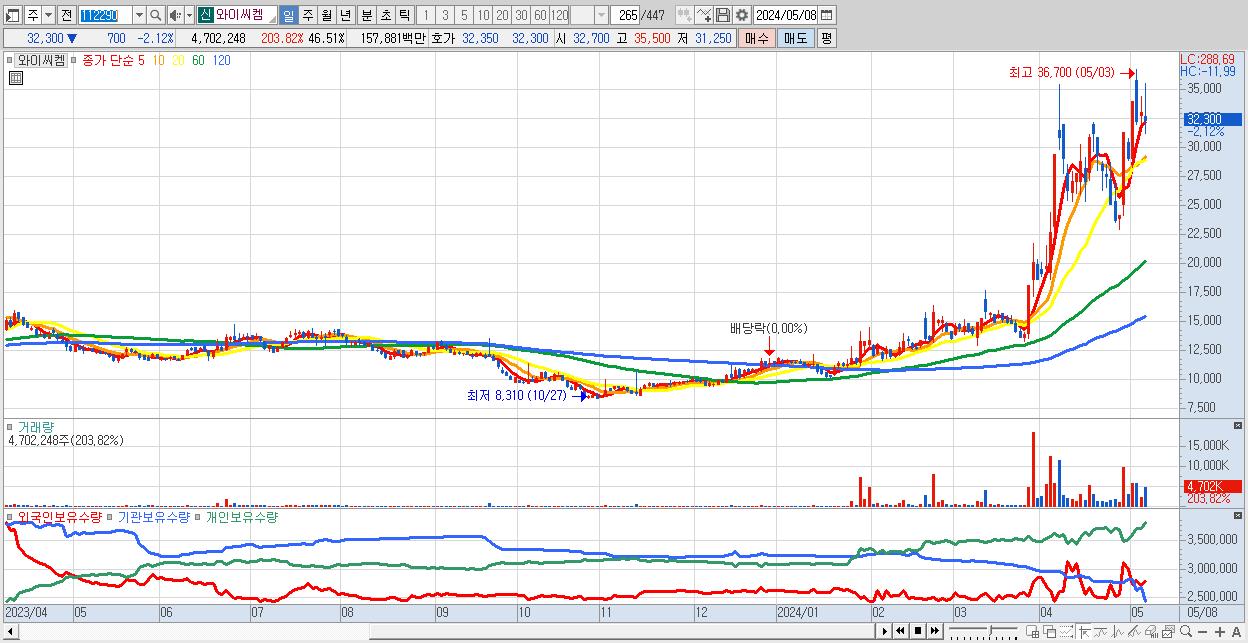 - 와이씨켐 (32,300원 ▼ -2.12% , 시총: 3,266억, 거래량: 4,702,248, 거래대금:1,579억)