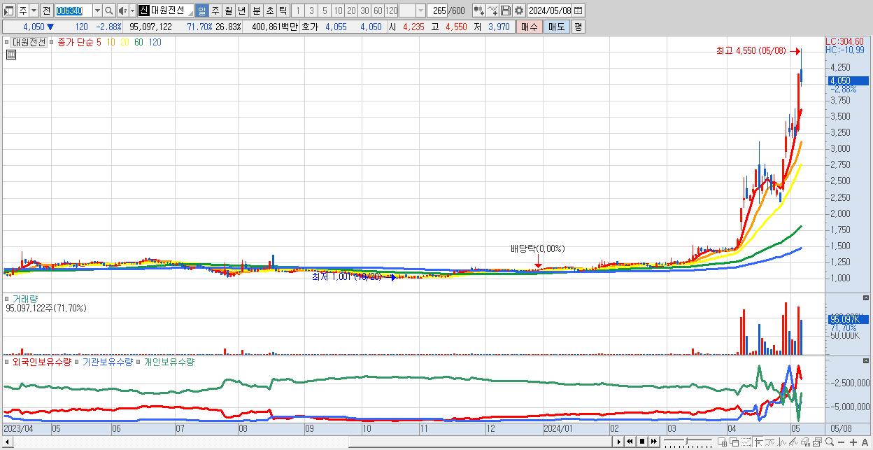 - 대원전선 (4,050원 ▼ -2.88% , 시총: 3,037억, 거래량: 95,097,122, 거래대금:4,009억)