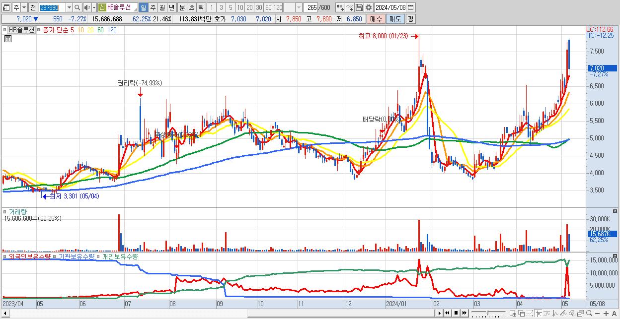 - HB솔루션 (7,020원 ▼ -7.27% , 시총: 5,133억, 거래량: 15,686,688, 거래대금:1,138억)