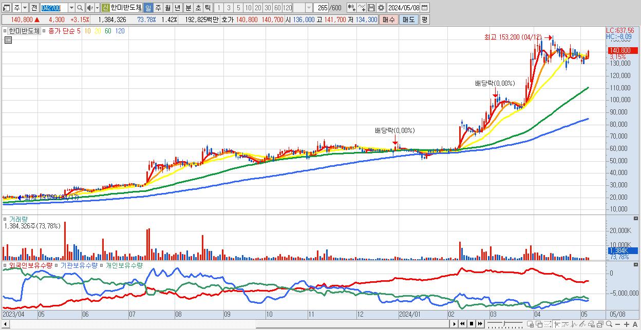 - 한미반도체 (140,800원 ▲ 3.15% , 시총: 137,054억, 거래량: 1,384,326, 거래대금:1,928억)