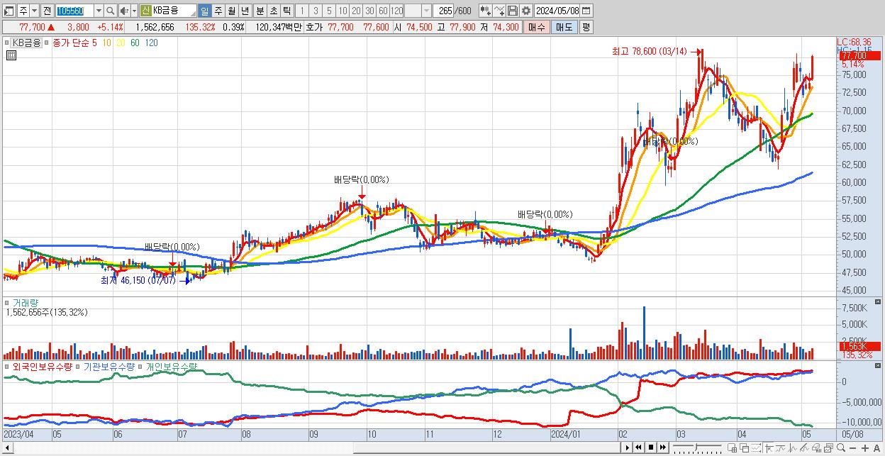 - KB금융 (77,700원 ▲ 5.14% , 시총: 313,528억, 거래량: 1,562,656, 거래대금:1,203억)